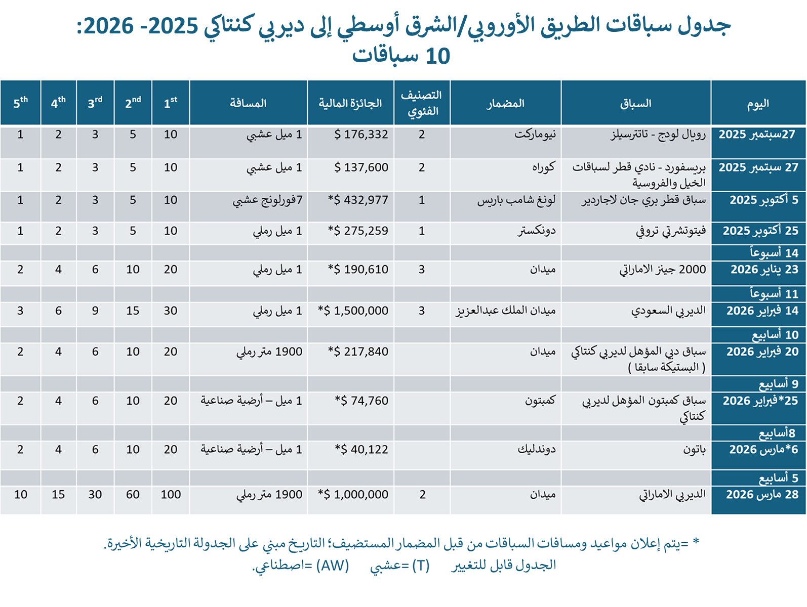 وبهذا الاعتماد، ينضم “الديربي السعودي” ابتداءً من نسخته المقبلة إلى سلسلة السباقات المرموقة المعروفة عالميًا بـ “الطريق إلى ديربي كنتاكي” (The Road to the Kentucky Derby)، والتي تُقام في مضامير عالمية مختلفة لاختيار أفضل الخيول للمنافسة في الحدث الكبير الذي يستضيفه مضمار “شيرشل داونز” بالولايات المتحدة.