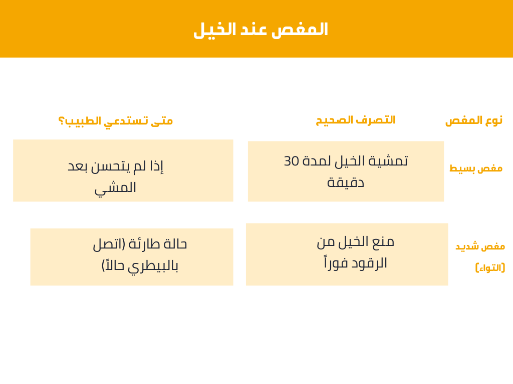 تكون عملية المشي لمدة 30دقيقة فقط لاغير ويتم ملاحظة اختفاء أعراض المغص من عدمه وإذا لم تختفي أعراض المغص فإن تدخل الطبيب البيطري المختص مهم جدا .