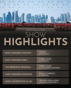 وبهذه النتائج، تسدل بطولة “سوبريم 2025” نجومها، وبما أن المنطقة العربية لا تزال هي مركز الثّقالي والمصدر الأول لجمال ونقاء الخيل العربية الأصيلة في العالم.